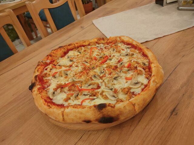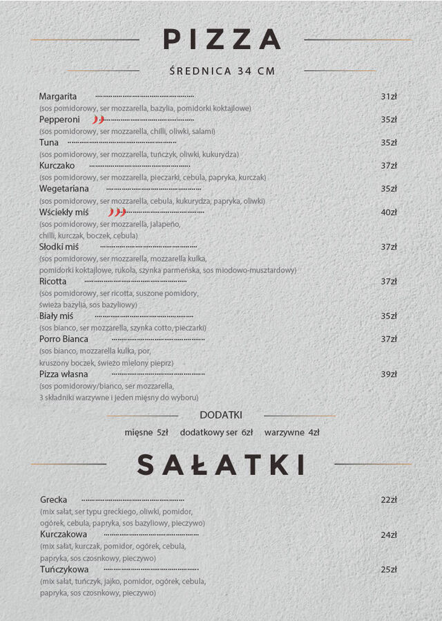 Pizza: Nasza pizza to prawdziwe dzieło sztuki kulinarnego rzemiosła. Delikatnie chrupiąca na zewnątrz, a jednocześnie miękka i soczysta wewnątrz, jest idealnym połączeniem tradycyjnego włoskiego smaku z nowoczesnymi dodatkami. Na cienkim cieście możesz znaleźć składniki najwyższej jakości, takie jak aromatyczne pomidory, świeże zioła, wykwintne sery oraz ulubione dodatki, które spełnią Twoje kulinarne marzenia.