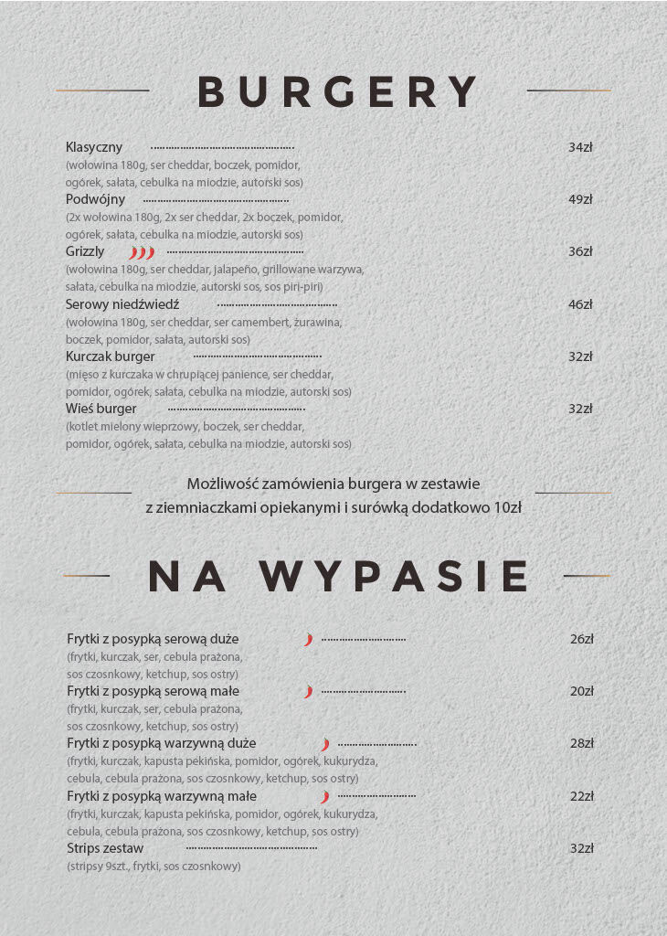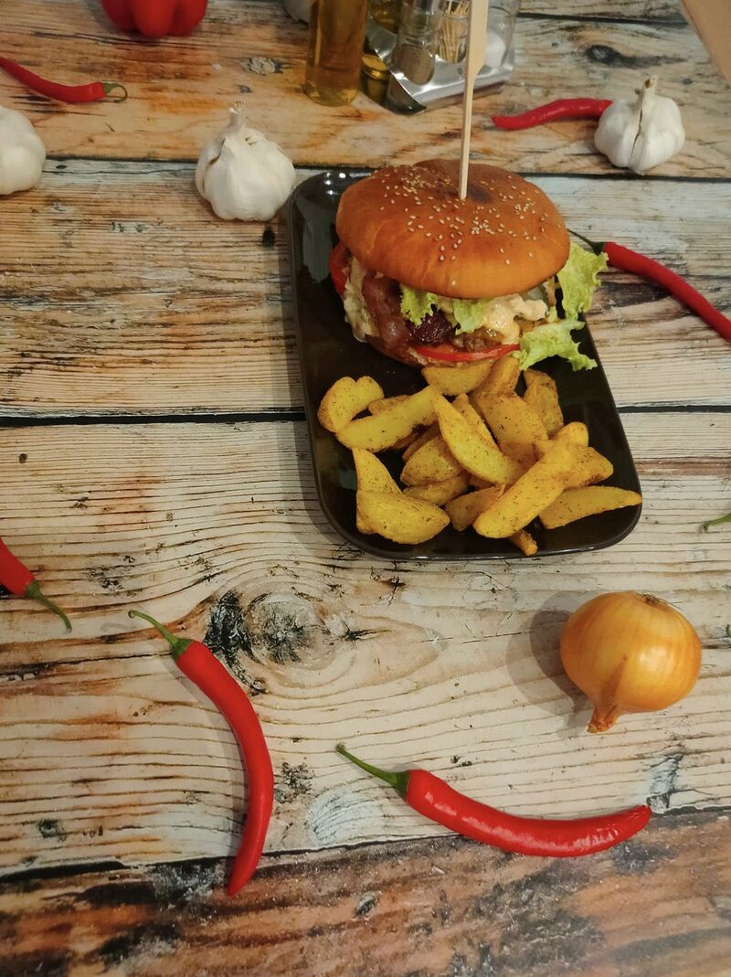 Burger: Nasz burger to hołd dla miłośników prawdziwego smaku. Soczysta wołowina lub kurczak, delikatnie grillowana, aż chrupie pod zębami, w towarzystwie świeżych warzyw i aromatycznych sosów. Wszystko to zawinięte w delikatną bułkę, która idealnie podkreśla smak mięsa i dodatków. To danie, które zaspokoi Twoją głód na coś wyjątkowego i satysfakcjonującego.
